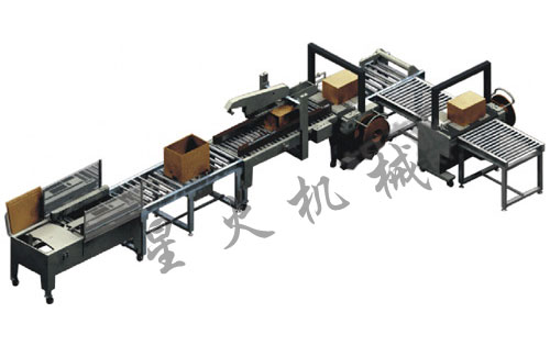 周口打包機(jī) 客戶名稱:周口鹿邑金日食用油有限公司 設(shè)備名稱:XFK-3自動(dòng)封底封箱“井”字捆扎包裝流水線